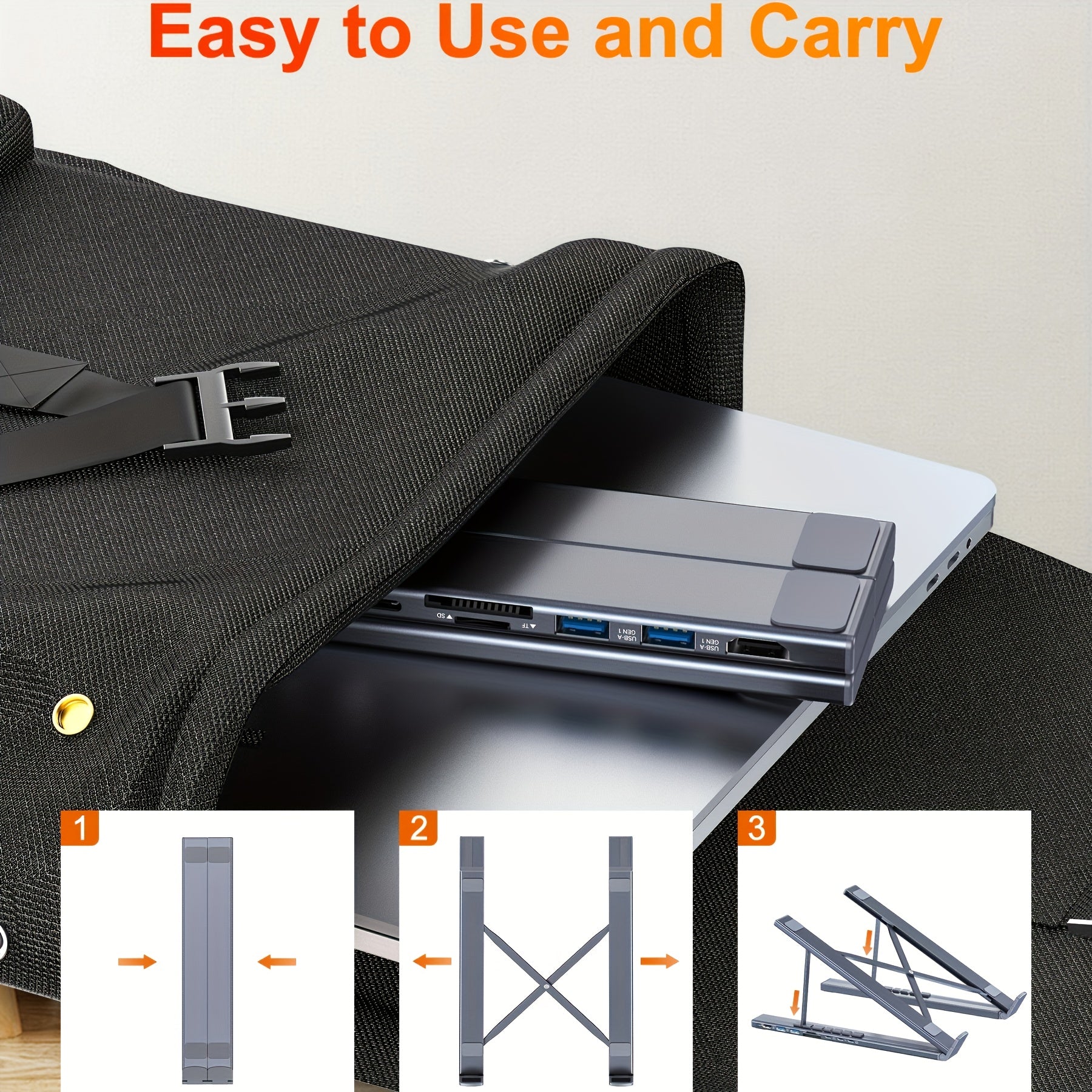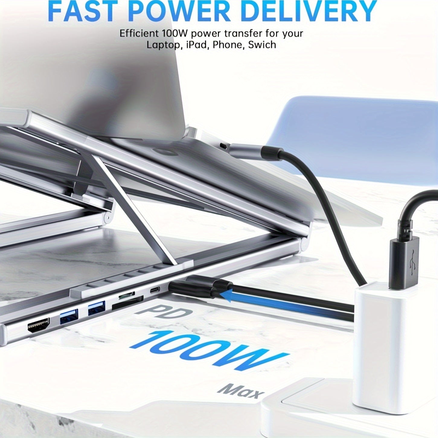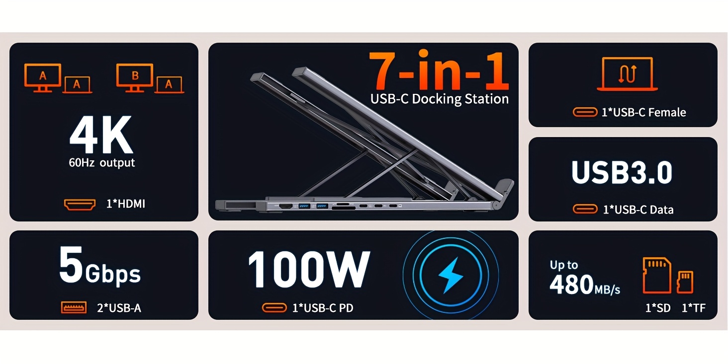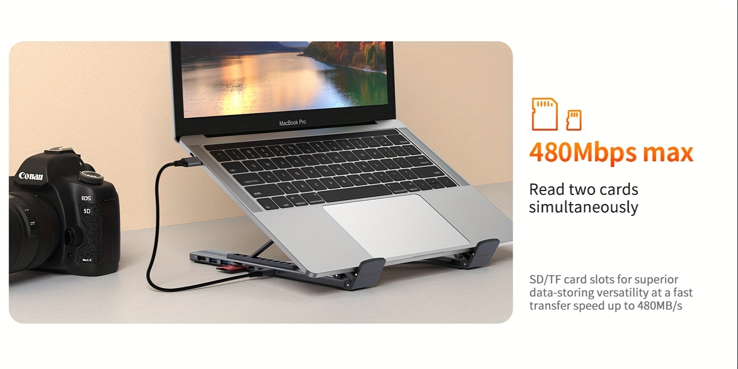 The portable laptop dock stand with 2*USB- A ports supports data transfer speed up to 5 Gbps, allowing you to transfer files quickly. Also connect a keyboard, mouse, U Flash drive or hard drive to your For MacBook Pro, For MacBook Air, Dell, and HP laptops without any lag. 1*USB-C data supports data transfer rates up to GEN1. SD/TF card slots for superior data-storing versatility at a fast transfer speed up to 104MB/s. A PD charging port support max 100W power delivery, max 85W charge your laptop.