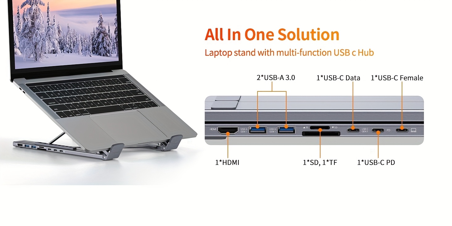 USB C Docking Station Stand: Our lightweight and foldable laptop stand safely supports laptops from 10-17 inches and features 8 integrated ports for all your connectivity needs. USB C docking station for USB C macOS and Windows laptops is equipped with 4K HDTV, 2*USB 3.1(up to 5Gbps), 1*USB C PD 3.0 port, and 1*USB-C Data, 1*SD, 1*TF(support simultaneous reading of USB3.0 data).