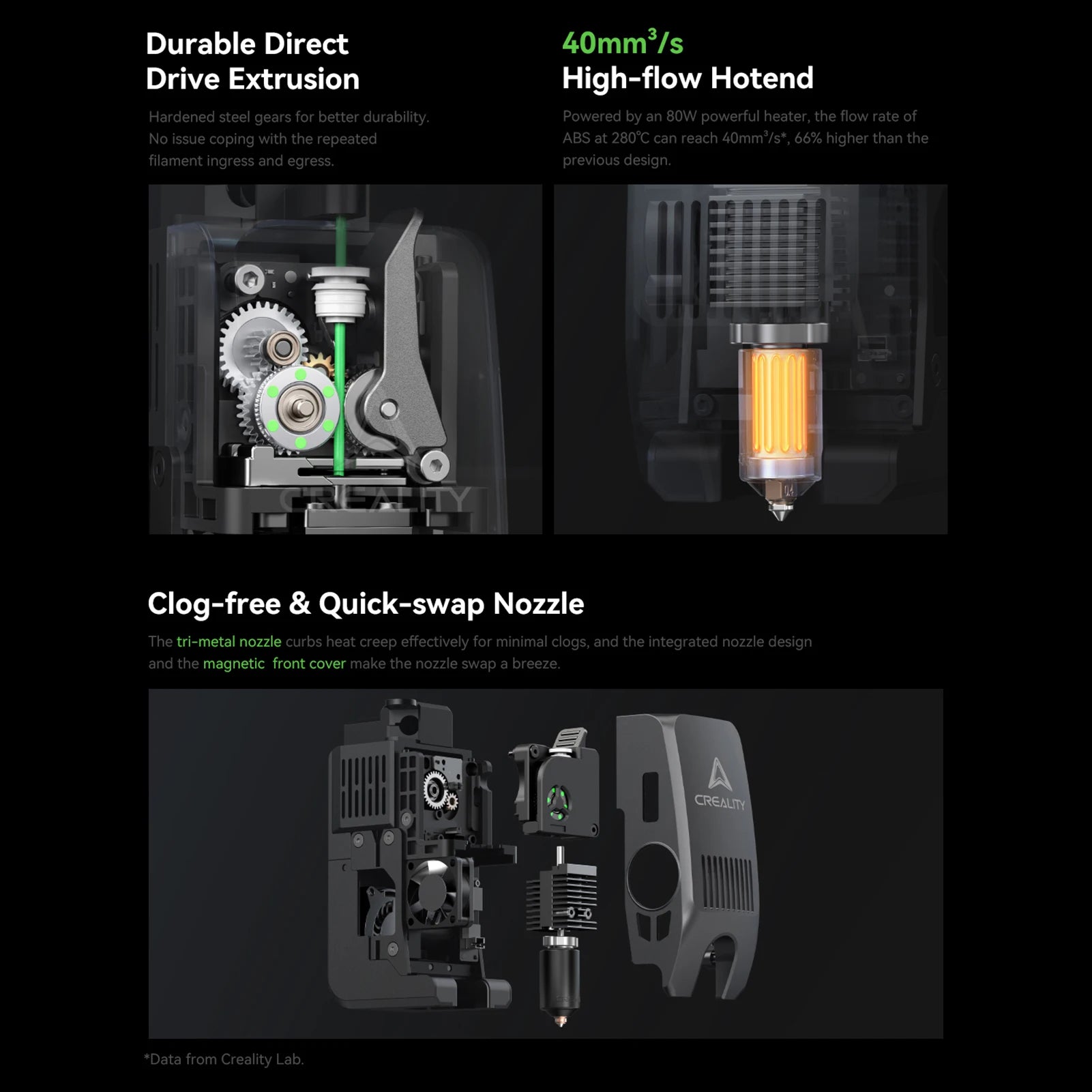 3. ✅ Master of Materials & Print Quality: The active chamber heater is adopted for up to 60°C temperature inside, which is golden to forge strong prints in ASA, PPA, and other high-end materials. The “Apus” direct drive extruder assembly allows for 350℃ printing with a max 40mm³/s flow and it is clog-free & easy to maintain. The nozzle tip is made of hardened steel to deal with wear-resistant engineering materials. Vibrations are minimized with a heavy-weight build and the input shaping algorithm. The dimensional accuracy of prints reaches 0.05mm. Meanwhile, there are two chamber-side auxiliary cooling fans for perfect part cooling. The shapes and styles will be set before any stringing and warping can happen.