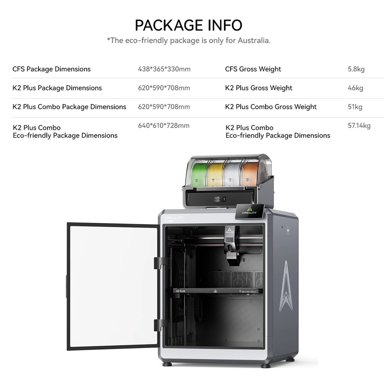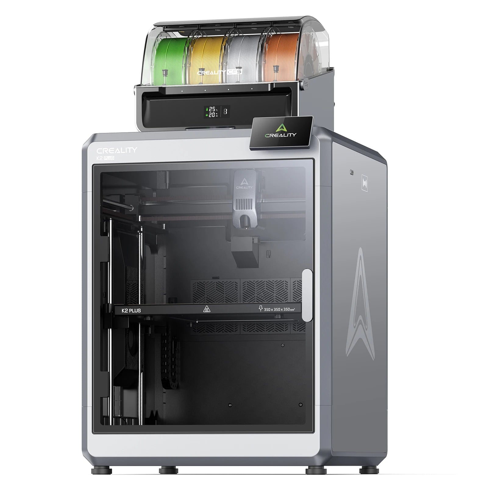 2. ✅ A King-sized & Quiet Powerhouse: As a pro-level 3D printing powerhouse, K2 Plus Combo offers an extraordinary 350*350*350mm build volume, great for handling larger objects or larger batches. It is the first desktop 3D printer that uses industry-grade FOC step-servo motors on all axis. Notably, each motor offers 32,768 controllable micro-steps per revolution*. No bumps while printing at a 600mm/s speed and 30000mm/s² acceleration. Not only this, it takes on a rigid all-metal “exoskeleton”, extremely robust XYZ axis, and a tight enclosure. The working noise at 300mm/s is only 45dB, no louder than someone typing on a laptop PC.