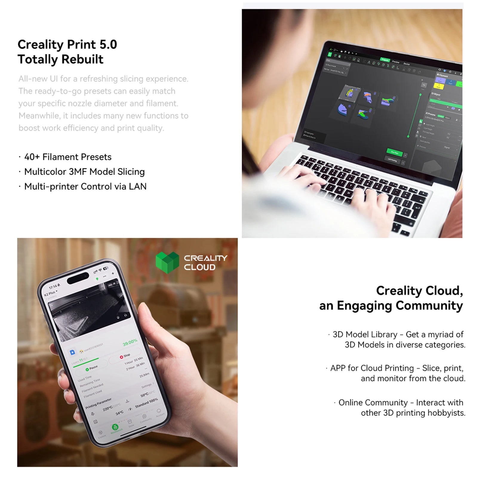 6. ✅ Epic Renewal of Software Ecosystem: The built-in Creality OS is profoundly evolved. It features smart multi-filament management and allows for fine-tuning in the expert mode or with root access. FLUIDD WebUI is also supported for your convenience. Meanwhile, the Creality Print 5.0 slicer has been completely rebuilt. It offers an all-new UI, 40+ filament presets, multi-printer control via LAN, and the ability to slice multicolor 3MF models. If you want to download third-party models or share your works with others, Creality Cloud is your go-to community.