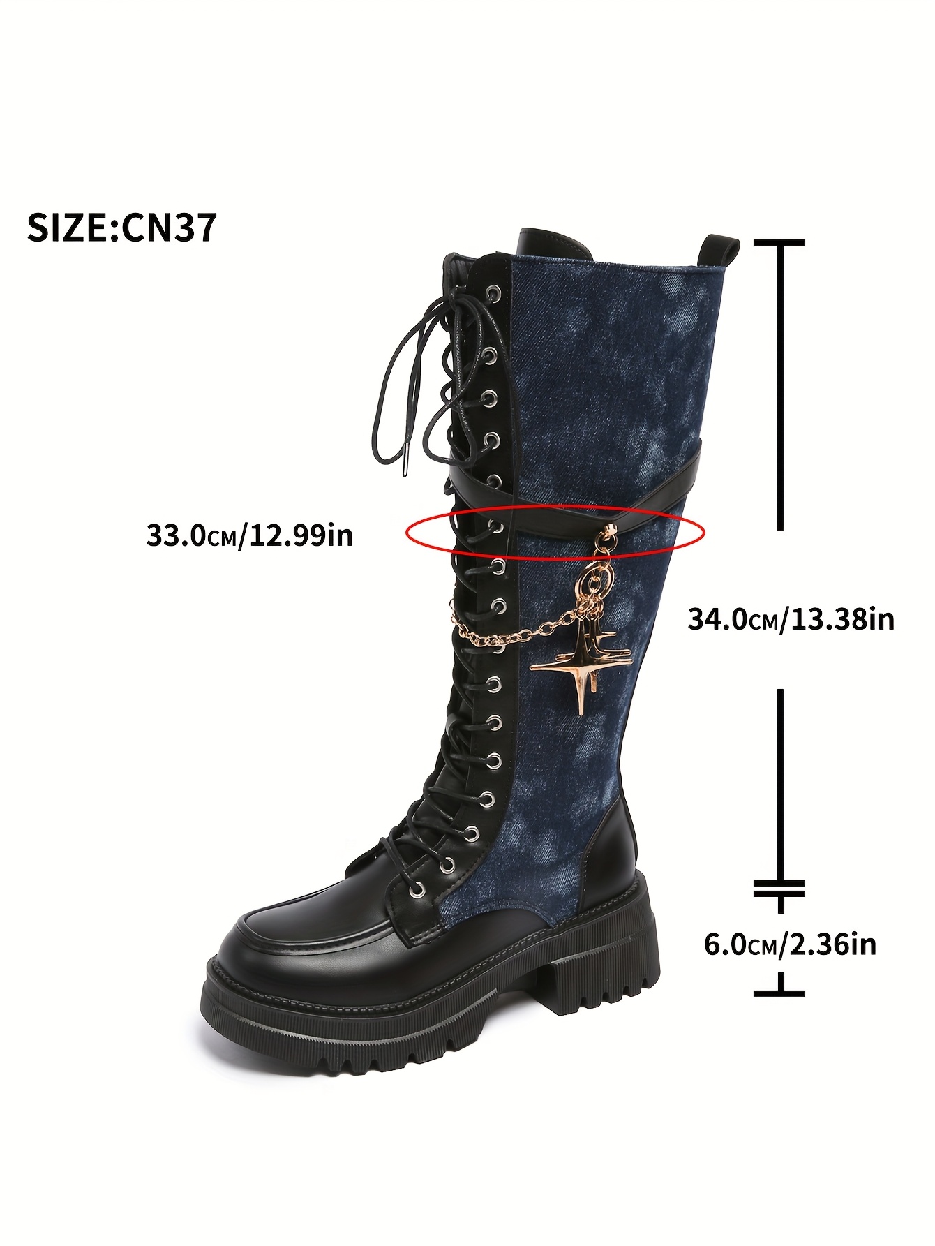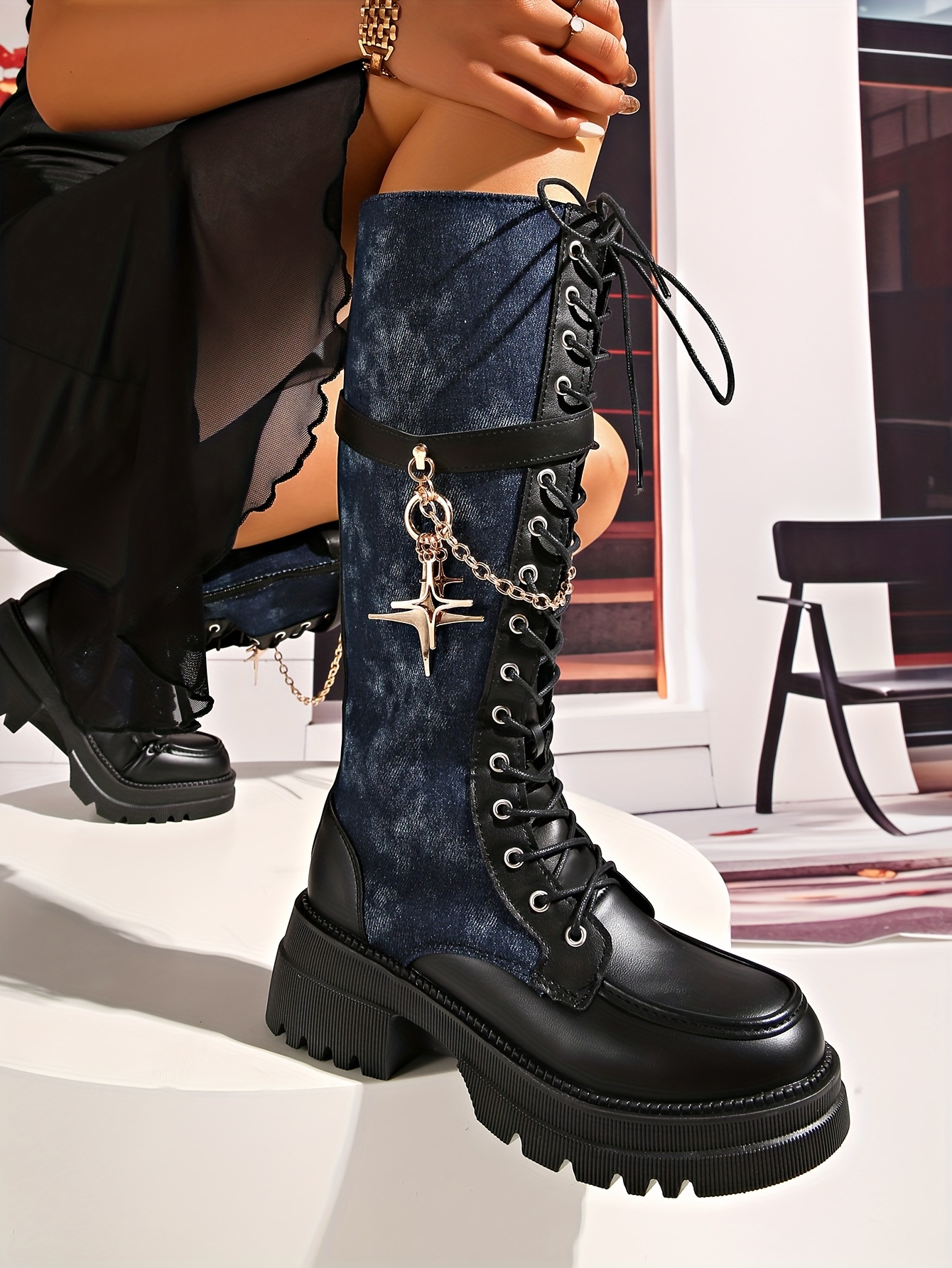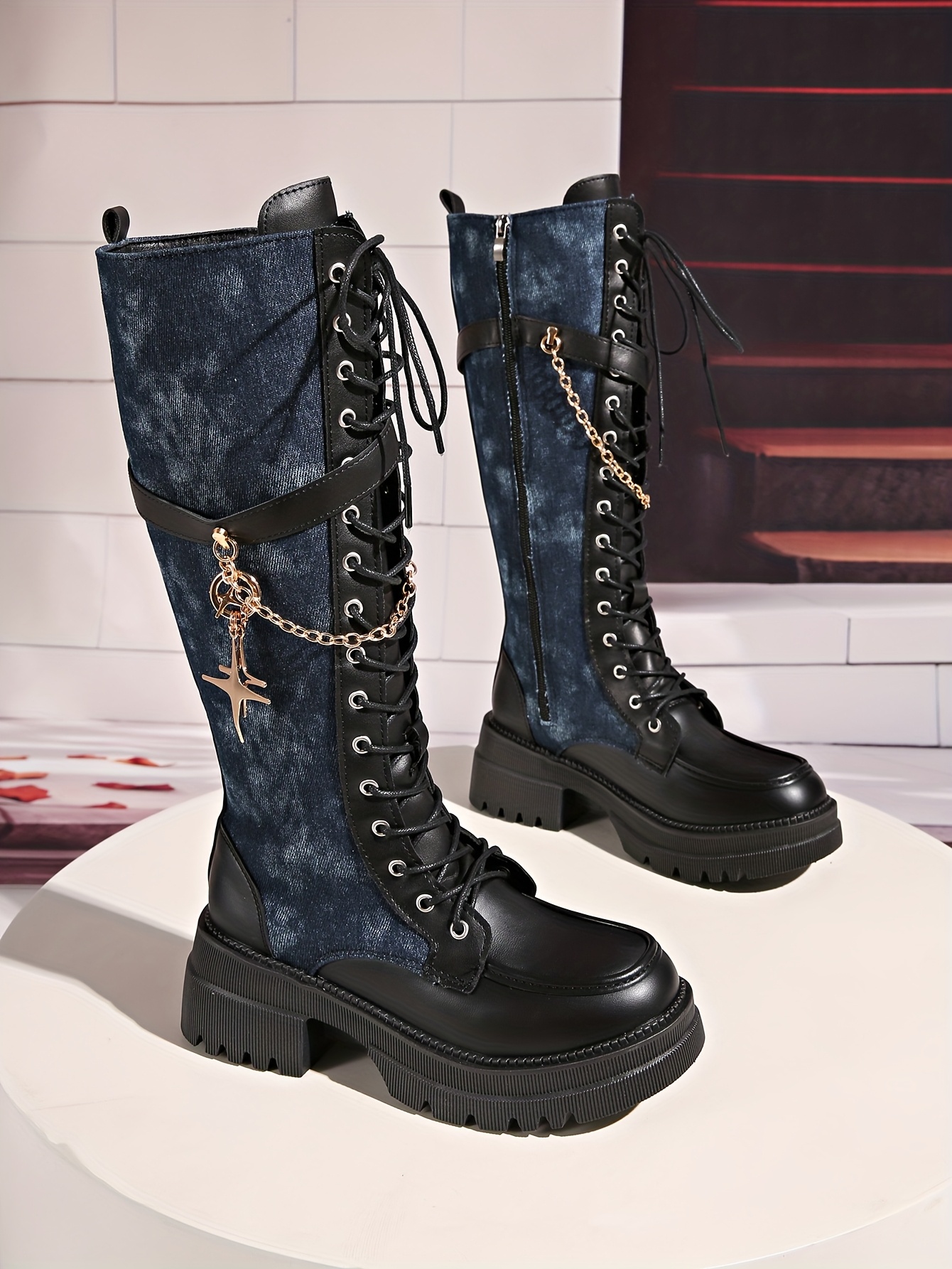 Women's Winter New Solid Color Patchwork Lace-Up Star Metal Chain Side Zipper Thick Sole Chunky Heel Knee-High Boots Fashion Versatile Casual High Heels
