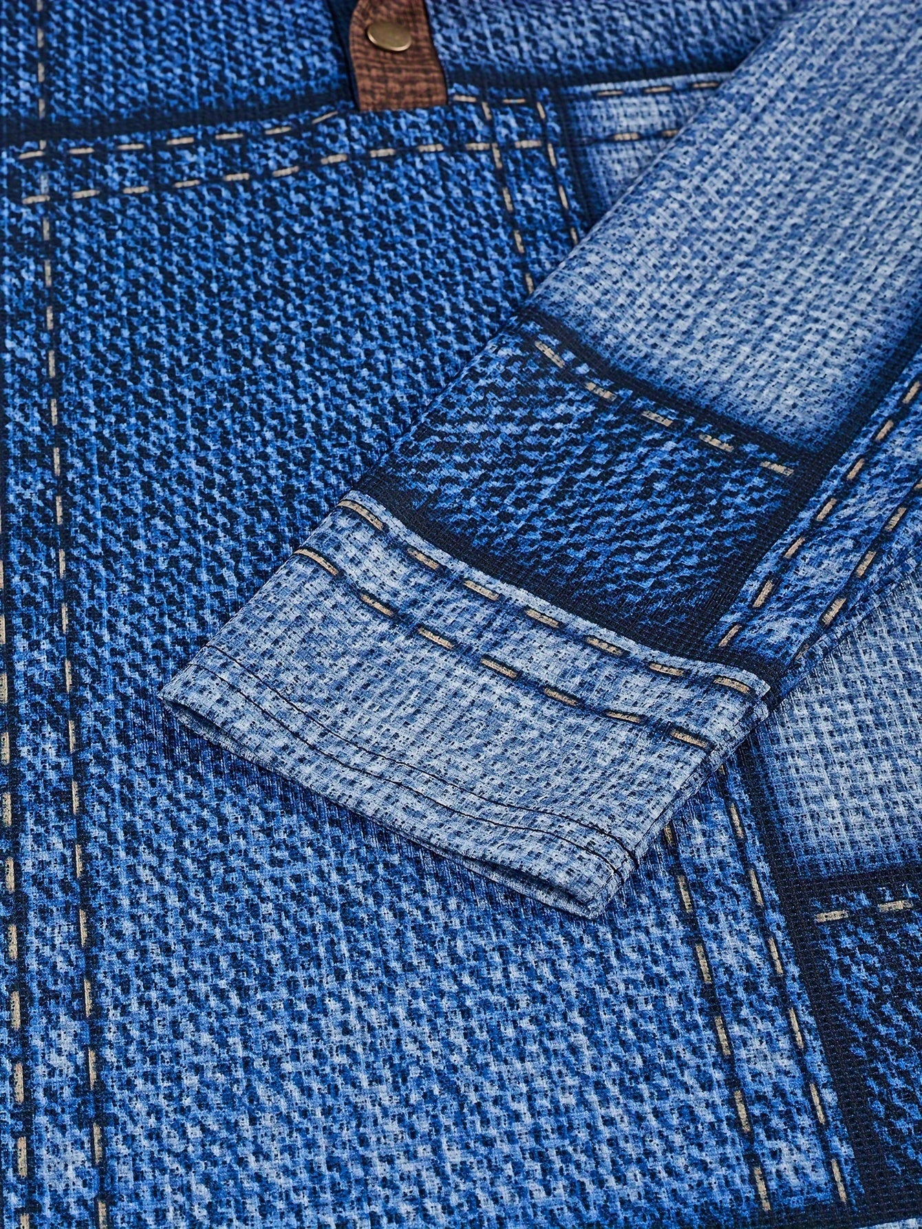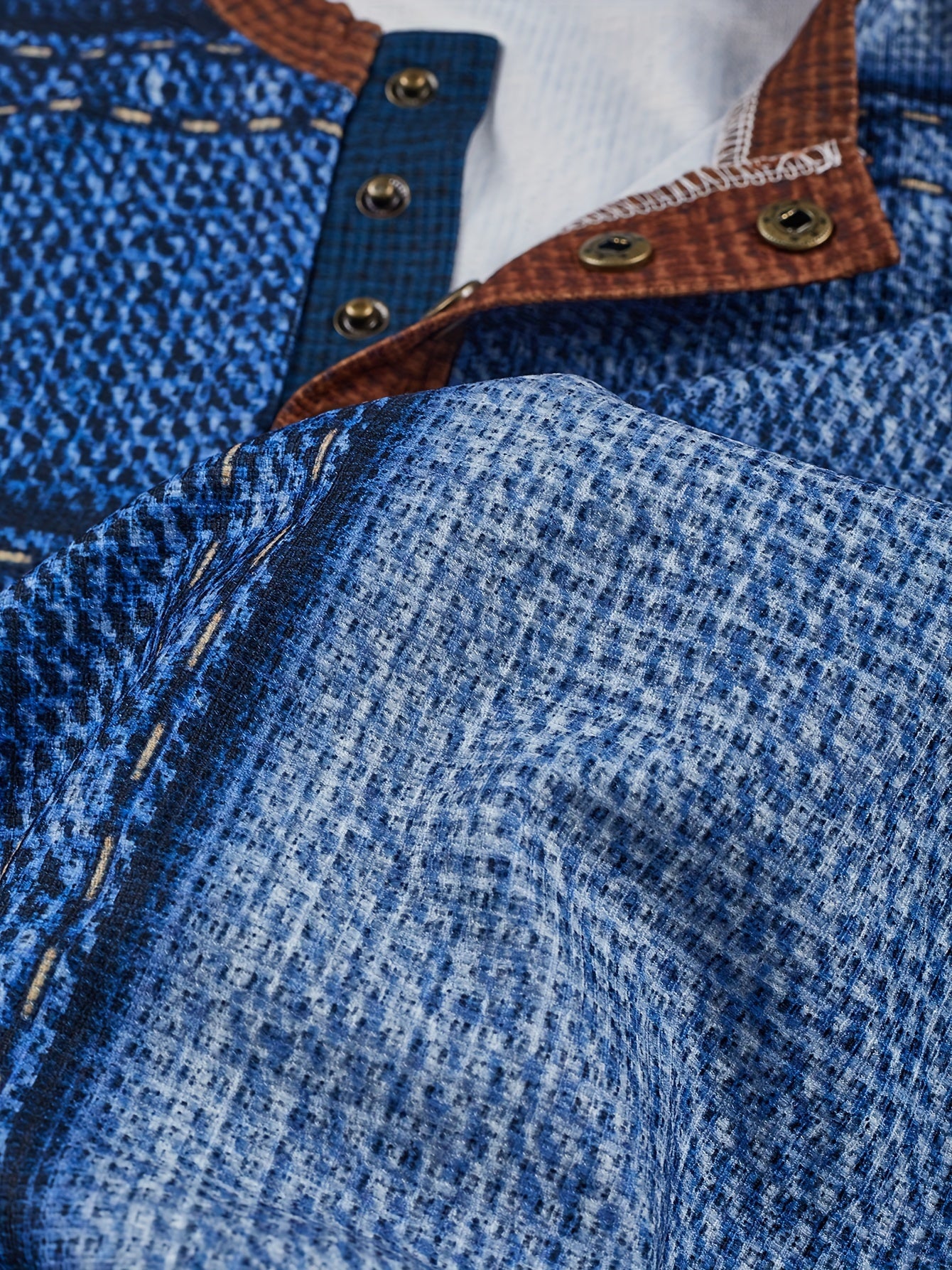 Men'S Casual Crew Neck Long Sleeve Geometric-pattern Henry Shirt, Slight Stretch Fabric, with Button and Heat Transfer Printing, for Outdoor, Spring/Fall
